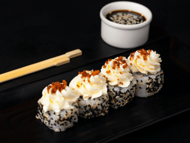 Inside out roll with fried king prawns, avocado, Japanese omelet and cream cheese.